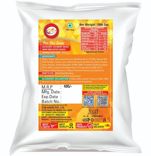 - Applications/Uses with – 10-15 gm (one table spoon) Peri Peri Sauce applies on pizza or parathans/flat roties and uses as dip for momos or non veg snacks.