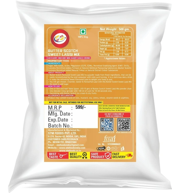 • About Product – Butter Scotch Sweet Lassi Mix is a powder made from finest ingredients that can be easily reconstituted by the end consumer with cold curd turning it into a delicious dairy drink.
