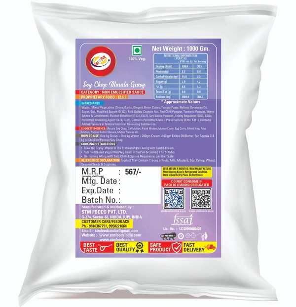 - Main Ingredients – Onion, Ginger Garlic Paste, Tomatoes, Salt, Sugar, Edible Soybean oil, Curd, Spices & Condiments etc.