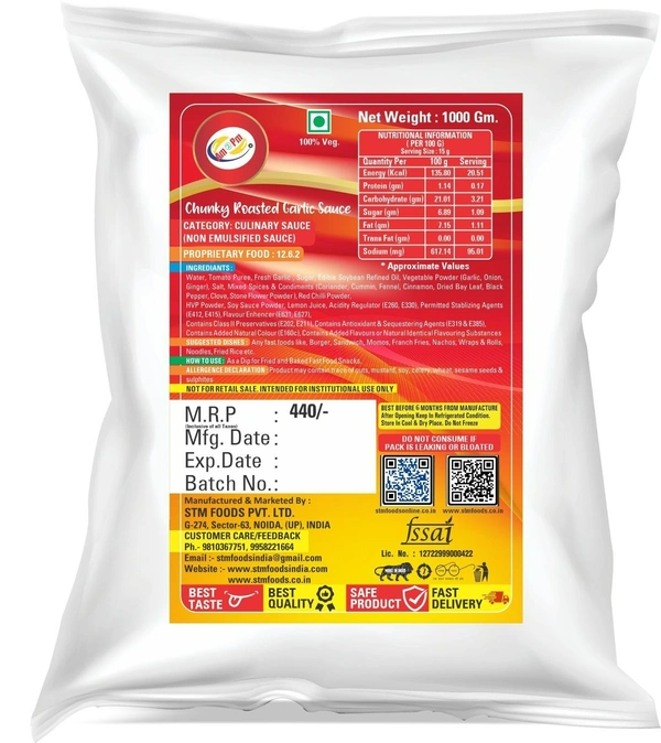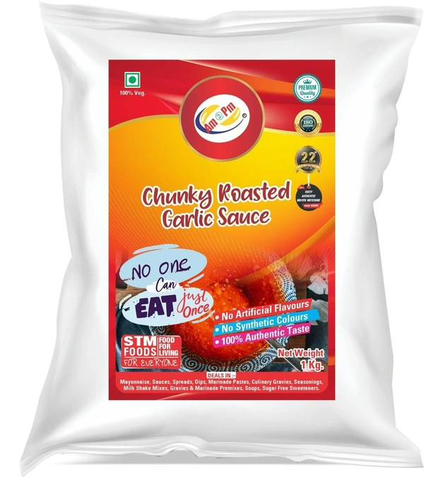 • Applications/Uses with – 10-15 gm (one table spoon) Chunky Roasted Garlic Sauce applies on pizza or parathans/flat roties and uses as dip for momos or non veg snacks.