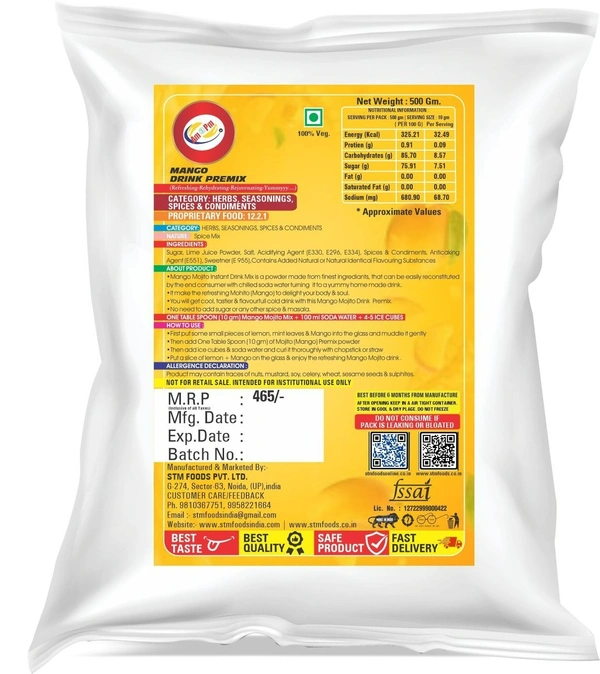 • Applications/Uses with – 10 gm (one table spoon) mango mojito mix powder taken in glass then add some mint leaves with some small pieces of lemon. After that add some pieces of mango and muddle it gently. Finally put some ice cubes with plain soda/sprite and churn it with spoon & served with garnishing of mango’s slice.
