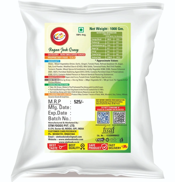 - Main Ingredients – Onion, Ginger Garlic Paste, Tomatoes, Green Chilli Paste, Salt, Sugar, Edible Soybean oil, Spices & Condiments etc.