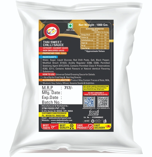 - Applications/Uses with – 20-25 gm (Two table spoon) Thai Sweet Chilli Sauce mix with Veggies/Salads or any Fast Foods