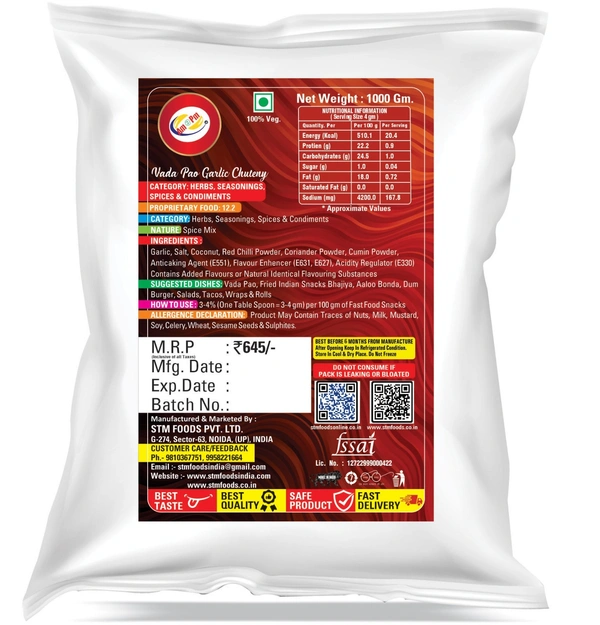 - Applications/Uses with – Approx 3-4 gm Vada Pao Dry Garlic Chuteny powder for vada pao or any foods per serving
