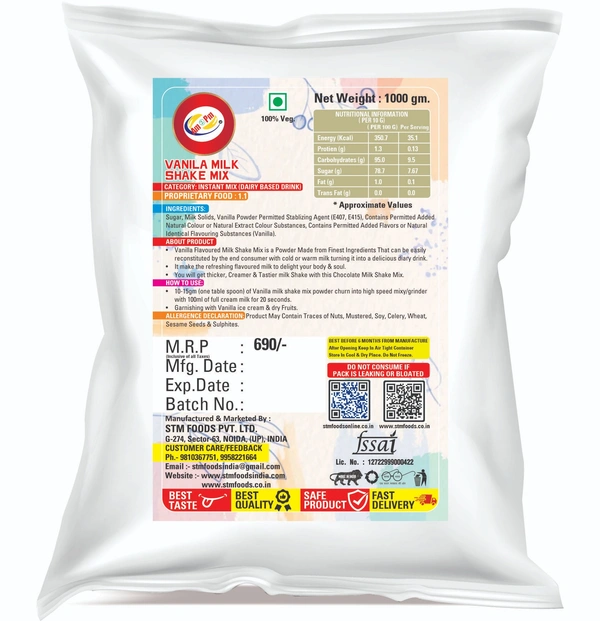 - About Product – Vanila Flavored Milk Shake Mix is a powder made from finest ingredients that can be easily reconstituted by the end consumer with cold or warm milk turning it into a delicious dairy drink.