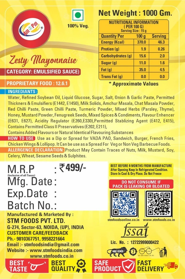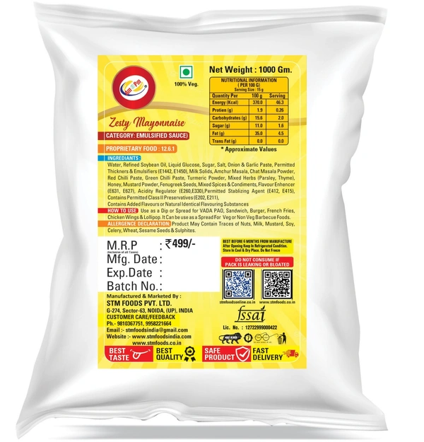 - Applications/Uses with – 10-20 gm (one to two table spoons) Zesty Mayo Spreads mix with any fast food snacks.